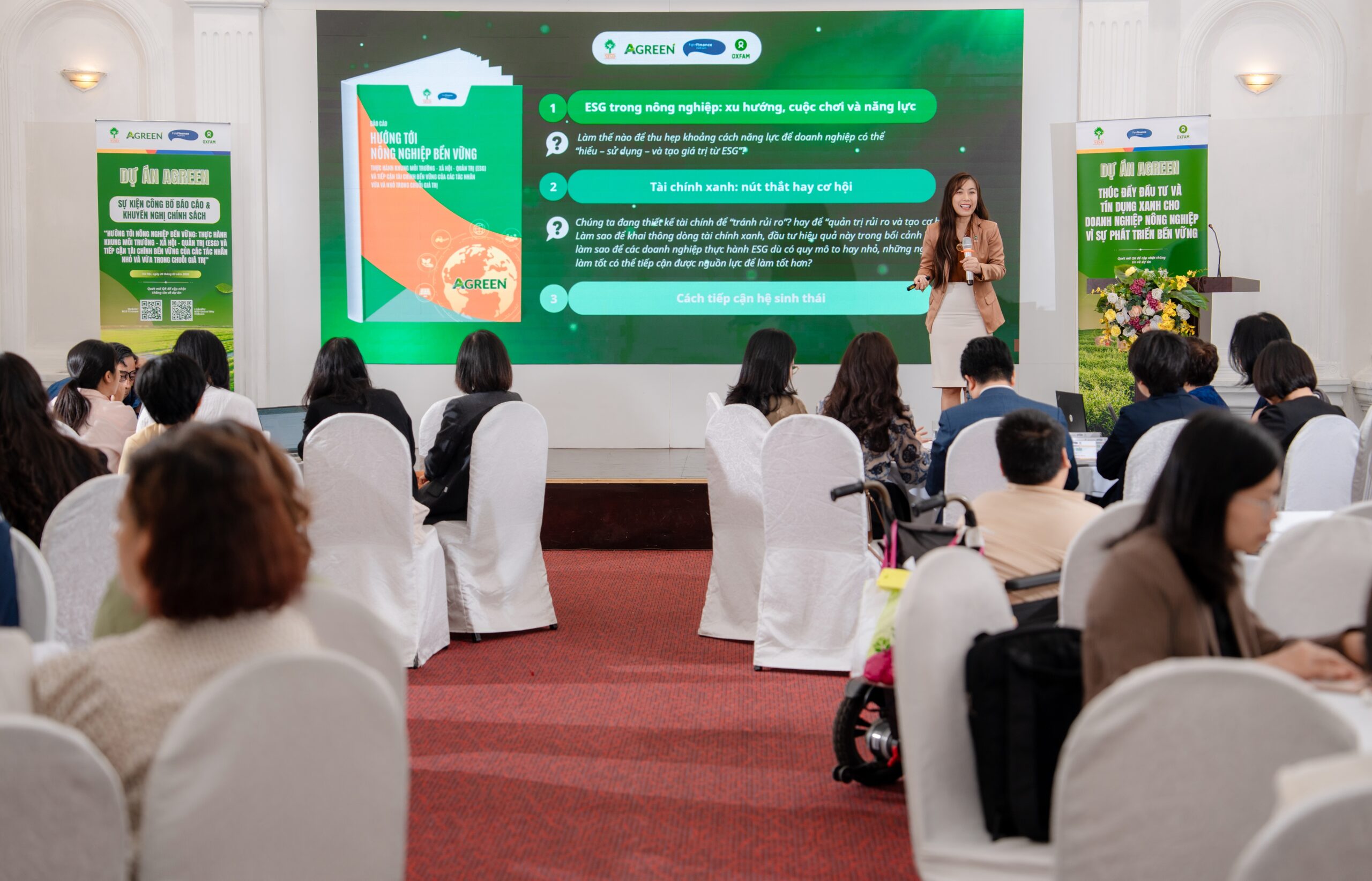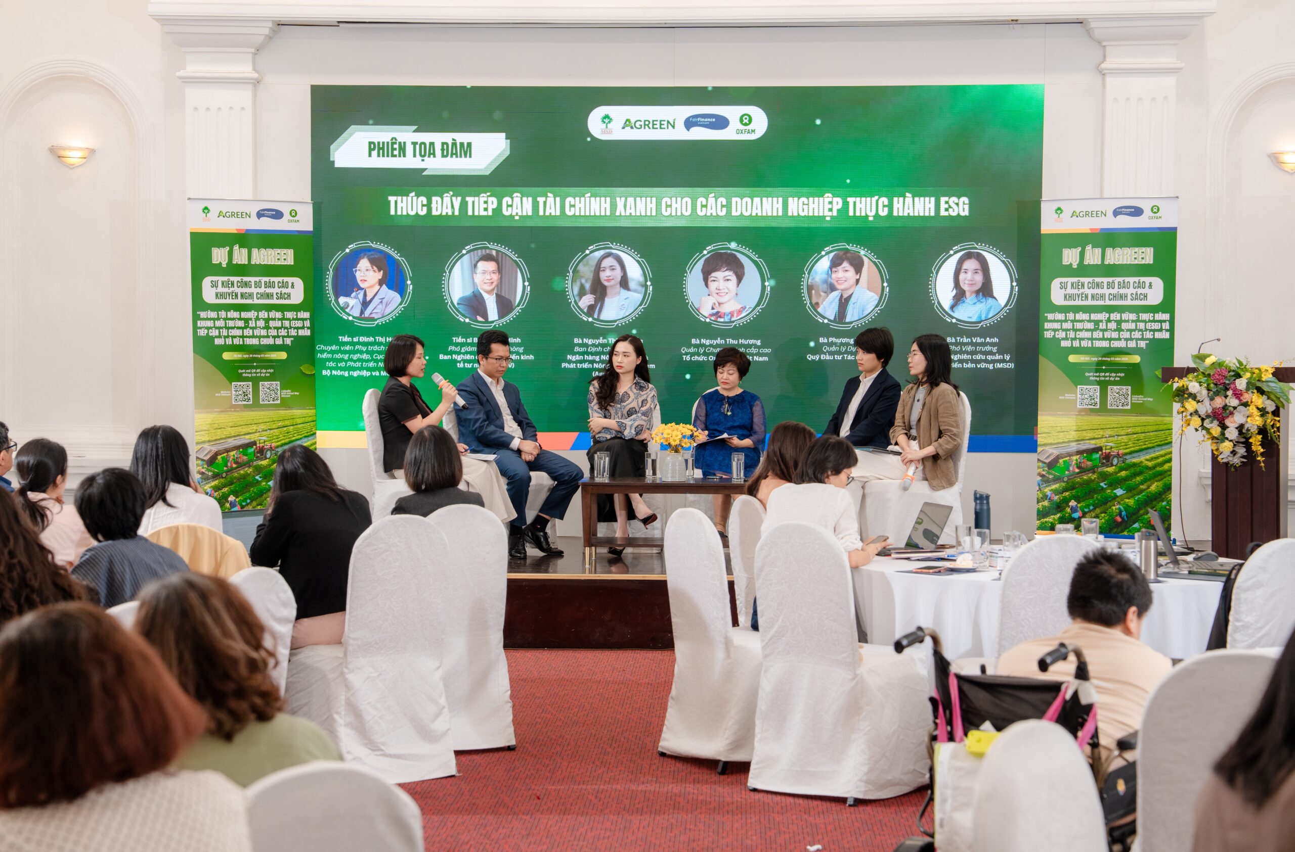 Sau phần công bố báo cáo, sự kiện tiếp tục với phiên tọa đàm đa bên về thúc đẩy tài chính xanh và thực hành ESG trong nông nghiệp, với sự tham gia của đại diện Bộ Nông nghiệp và Môi trường, Ban Nghiên cứu phát triển kinh tế tư nhân (Ban IV), Ngân hàng Nông nghiệp và Phát triển Nông thôn Việt Nam (Agribank), Oxfam tại Việt Nam, Quỹ Impact Investment Exchange (IIX).